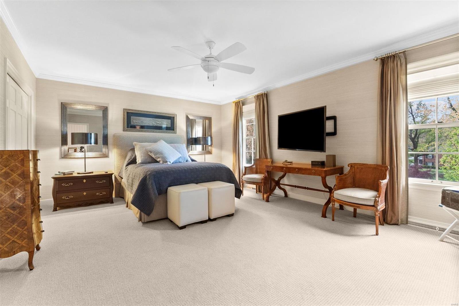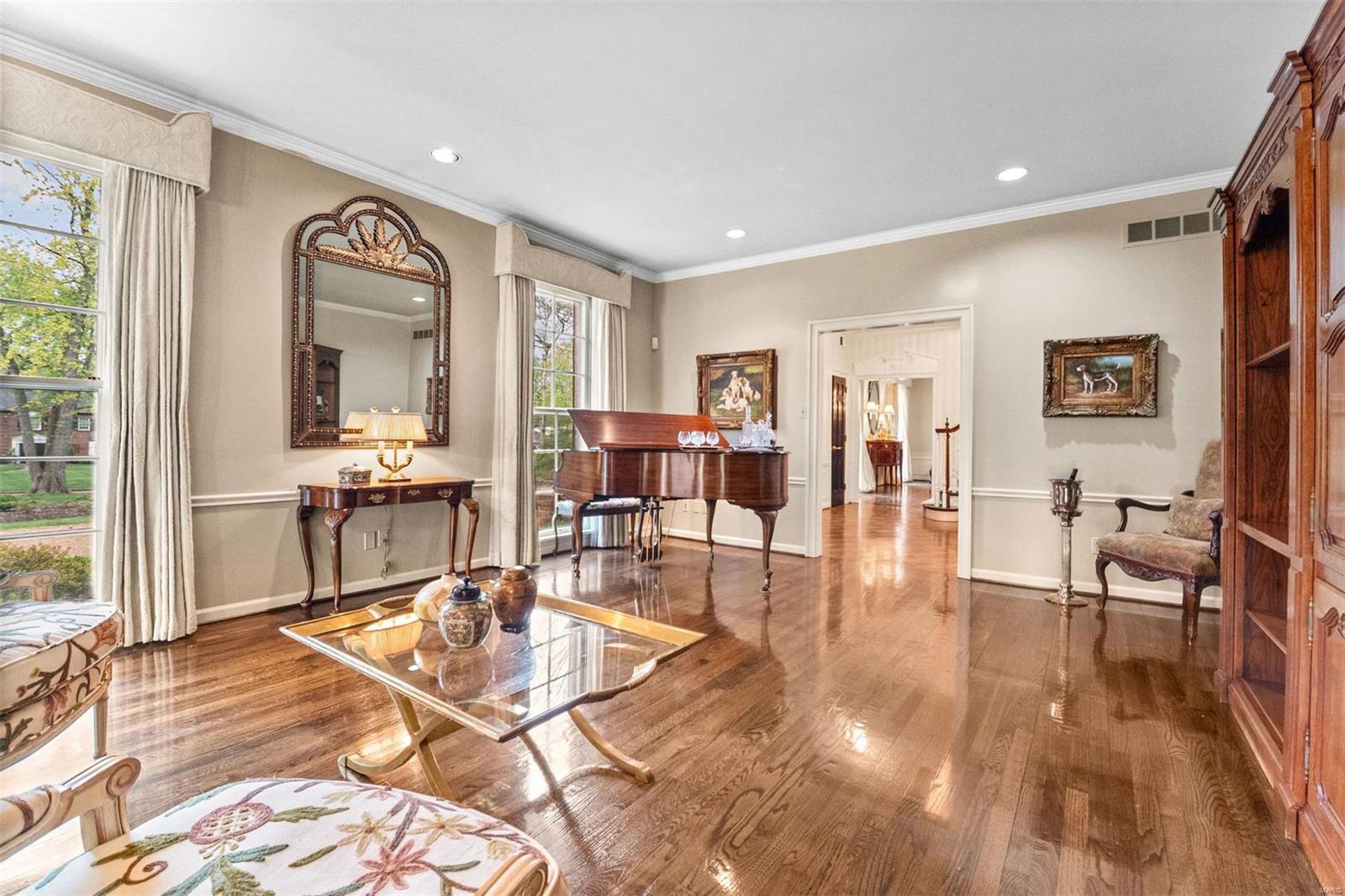 Gorgeous Georgian Colonial sits graciously on 1.8 acres on coveted Log Cabin Drive. Classic red brick & symmetrical architecture define the home's distinguished exterior. A grand two-story foyer & first floor flow, are ideal for entertaining, with generously sized living and dining rooms w/ floor-to-ceiling windows. Modern amenities include a wet bar & first-floor mudroom/laundry w/1/2 bath. A gourmet kitchen w/custom cabinetry, Sub Zero & Wolf appliances, opens to a handsome, wood-beamed hearth room. A sweeping staircase up to the primary suite & office, 4 addt'l bedrooms & 4 baths & bonus room. The lower level has an expansive recreation room, bar, 1/2 bath w/2 separate seating areas & ample storage. This private estate oozes luxury w/professionally installed landscape lighting, pool & pool house w/full kitchen, 2 full baths & an extra garage space ideal for a golf cart or exercise room all providing a personal sanctuary within walking distance to Ladue shops & schools.